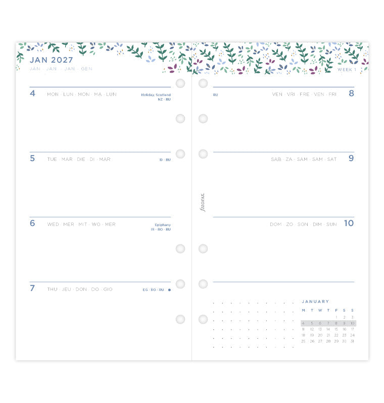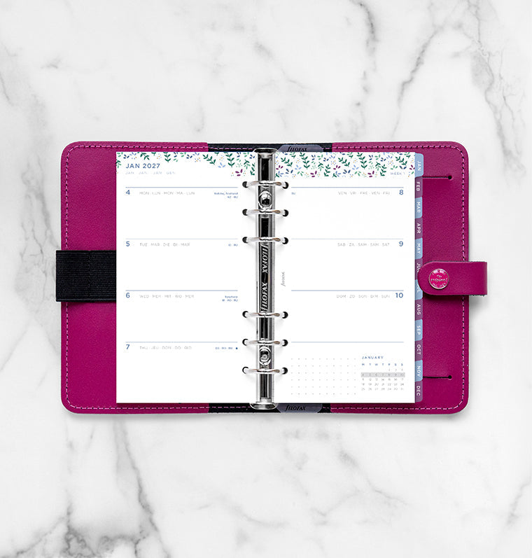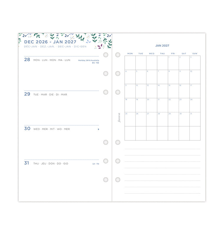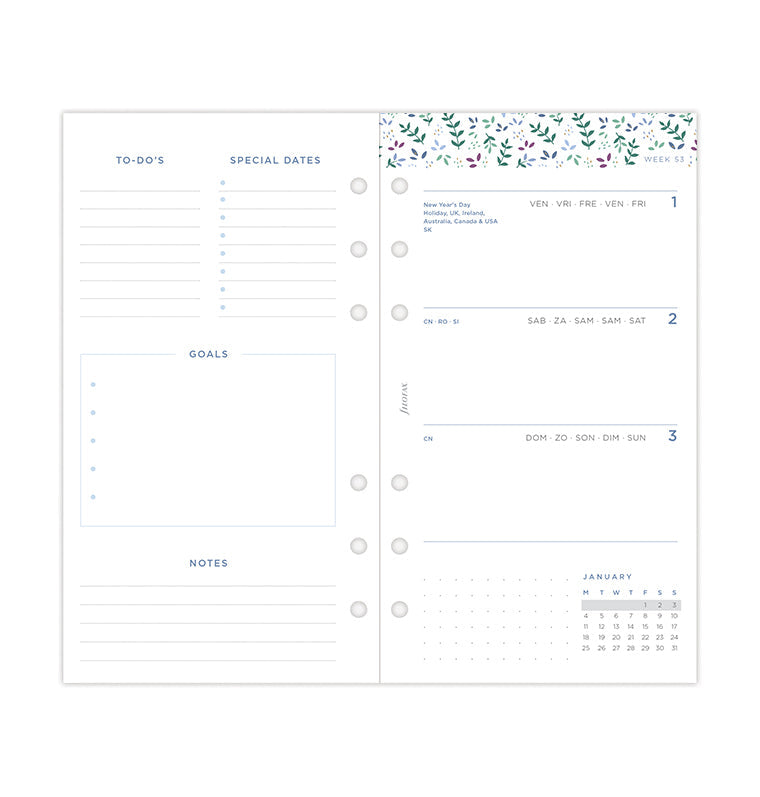 Planen Sie volle Fahrt voraus mit unserer Kalendereinlage aus der Garden Collection. Diese florale Personal Einlage bietet 1 Woche auf 2 Seiten in horizontaler Ausführung mit wunderschönen Design Akzenten, die Ihre Kreativität und Freude zum Erblühen bringen. Die "Belongs to"- Seite, sorgt für eine persönliche Note. Die Übersichten des aktuellen und des nächsten Jahres sind enthalten, um auch bereits im Voraus planen zu können, während die Monatsübersichten jeweils den neuen Monat einleiten. Entdecken Sie den Abschnitt "Big Plans" mit punktkarierter Ausführung für monatliche Ziele. Am Ende des Kalenders finden Sie zusätzlich punktkarierte und linierte Seiten, perfekt für Notizen und Kritzeleien. Multilingual. Füllhalterfreundliches Papier.
