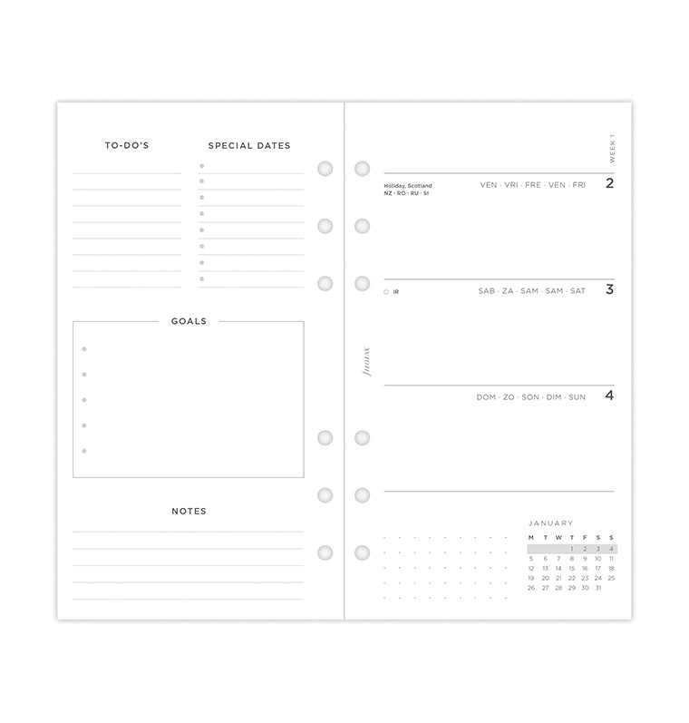 Verleihen Sie Ihren Plänen Flügel mit unserer Minimal Kalendereinlage. Diese moderne Personal-Einlage bietet ein horizontales Layout für die Wochenansicht in ganz frischer Ausführung für Organisation in allen Varianten. Die "Belongs to"- Seite, sorgt für eine persönliche Note. Die Übersichten des aktuellen und des nächsten Jahres sind enthalten, um auch bereits im Voraus planen zu können, während die Monatsübersichten jeweils den neuen Monat einleiten. Entdecken Sie den Abschnitt "Big Plans" mit punktkarierter Ausführung für monatliche Ziele. Am Ende des Kalenders finden Sie zusätzlich punktkarierte und linierte Seiten, perfekt für Notizen und Kritzeleien. Multilingual. Füllhalterfreundliches Papier.