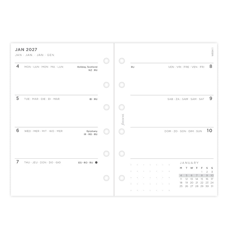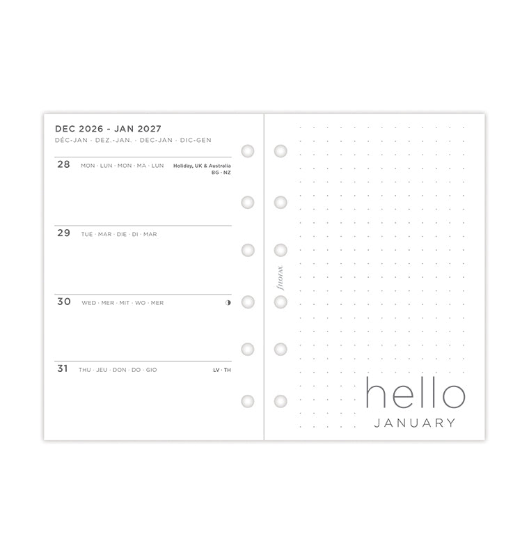 Verleihen Sie Ihren Plänen Flügel mit unserer Minimal Kalendereinlage. Diese moderne Pocket-Einlage bietet ein horizontales Layout für die Wochenansicht in ganz frischer Ausführung für Organisation in allen Varianten. Die "Belongs to"- Seite, sorgt für eine persönliche Note. Die Übersichten des aktuellen und des nächsten Jahres sind enthalten, um auch bereits im Voraus planen zu können, während die Monatsübersichten jeweils den neuen Monat einleiten. Entdecken Sie den Abschnitt "Big Plans" mit punktkarierter Ausführung für monatliche Ziele. Am Ende des Kalenders finden Sie zusätzlich punktkarierte und linierte Seiten, perfekt für Notizen und Kritzeleien. Multilingual. Füllhalterfreundliches Papier.