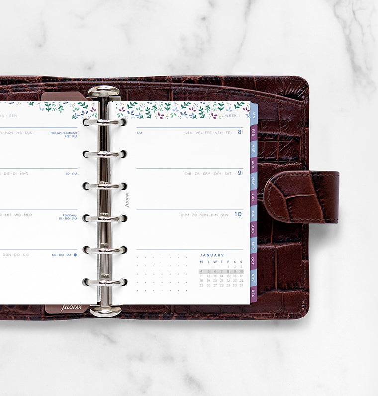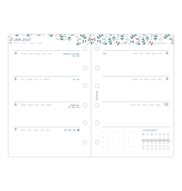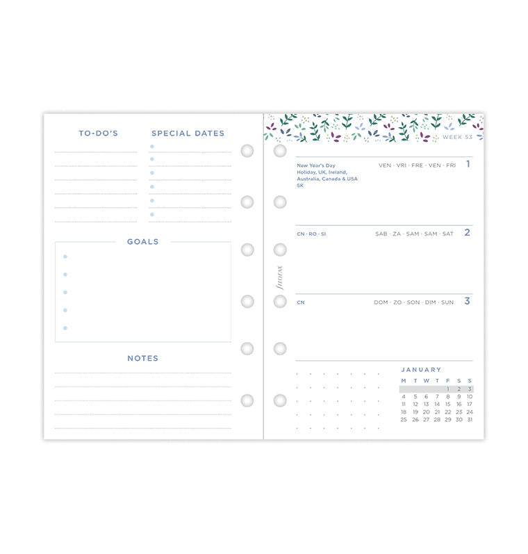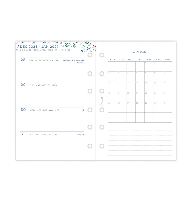 Planifica de antemano con nuestro recambio de la colección Garden. Este recambio de flores ofrece un diseño horizontal de 1S/2P con hermosos detalles, para infundir creatividad y alegría. . Incluye una página "Pertenece a" diseñada para añadir un toque personal. Se incluyen calendarios del año en curso y del siguiente para que pueda planificar con antelación, mientras que las páginas del panel invitan a comenzar un nuevo mes. Descubra la sección "Grandes planes" con páginas de puntos para los objetivos mensuales. Al final del calendario, también encontrarás páginas punteadas y rayadas, perfectas para tus notas y garabatos. Multilingüe. Papel apto para pluma estilográfica. 116 hojas - 80g. papel blanco