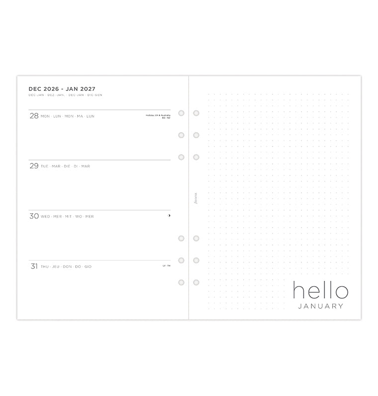 Ajoutez une touche personnelle à vos plans avec notre recharge Minimal. Cette recharge A5 contemporaine offre une mise en page horizontale de type "une semaine sur deux pages" et des pages blanches unies pour une organisation sans fin. Elle comporte une page "appartient à" conçue pour ajouter une touche personnelle. Les calendriers de l'année en cours et de l'année prochaine sont inclus pour vous permettre de planifier à l'avance, tandis que les pages du tableau de bord convivial invitent au début d'un nouveau mois. Découvrez la section "Grands projets" avec des pages en pointillés pour les objectifs mensuels. À la fin de l’agenda, vous trouverez également des pages en pointillés et lignées, parfaites pour vos notes et gribouillages. Multilingue. Papier adapté au stylo-plume.